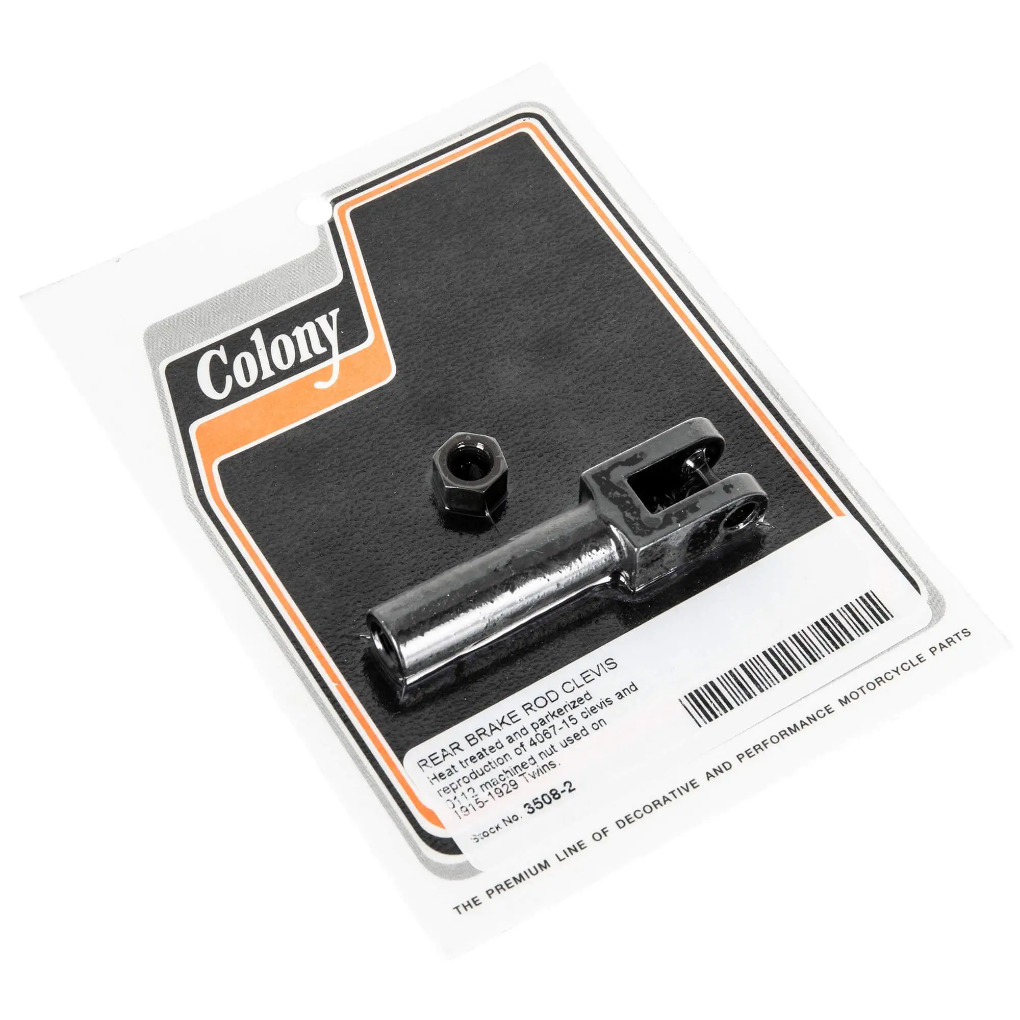 Colony Machine #3508-2 Rear Brake Rod Clevis 1915-1929 Harley-Davidson Twins. Heat treated and parkerized reproduction of 4067-15 clevis and 0112 machined nut used on 1915-1929 Twins. Made in Ohio, USA.